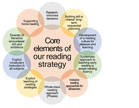 Our overall reading strategy is built around nine core elements that are implemented effectively and constantly monitored. By ensuring that each of these areas is successful, we guarantee a high-quality, rich reading experience for all pupils.